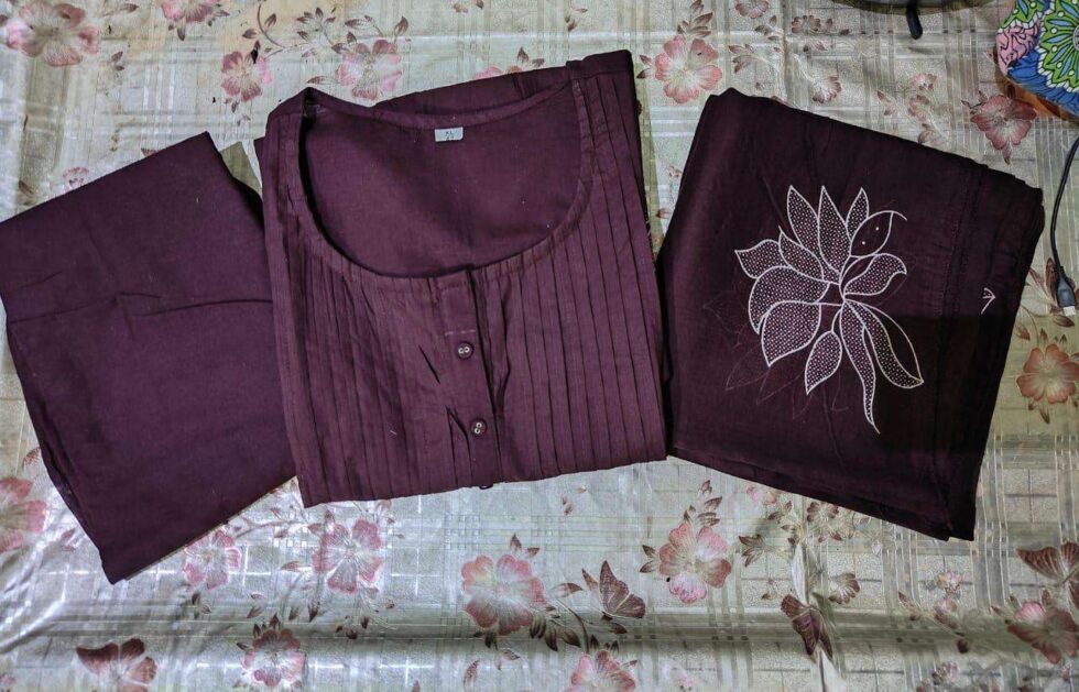 purple Long Kurta having Discharge Floral Print and Printex, Pants & Dupatta Size-XL