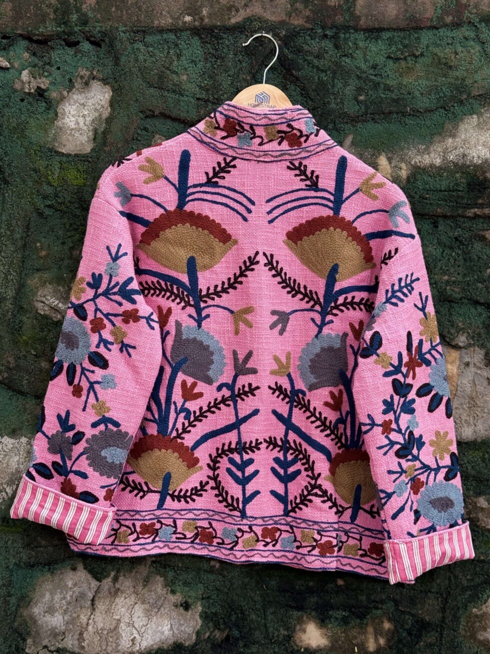 Womens Pink Velvet Embroidered Jacket with Floral Design